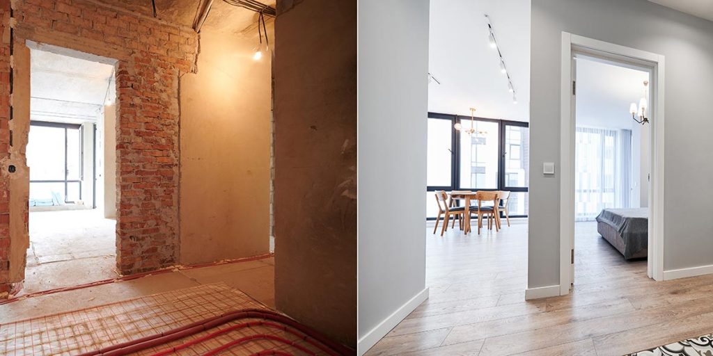 Renovation focuses on cosmetic updates and on restoring what you already have in your home to make it more attractive, fresh, and current. Renovation projects often include a coat of fresh paint, new flooring, updated cabinets, or new fixtures. It’s all about improving the look and feel of a room without altering its structure.